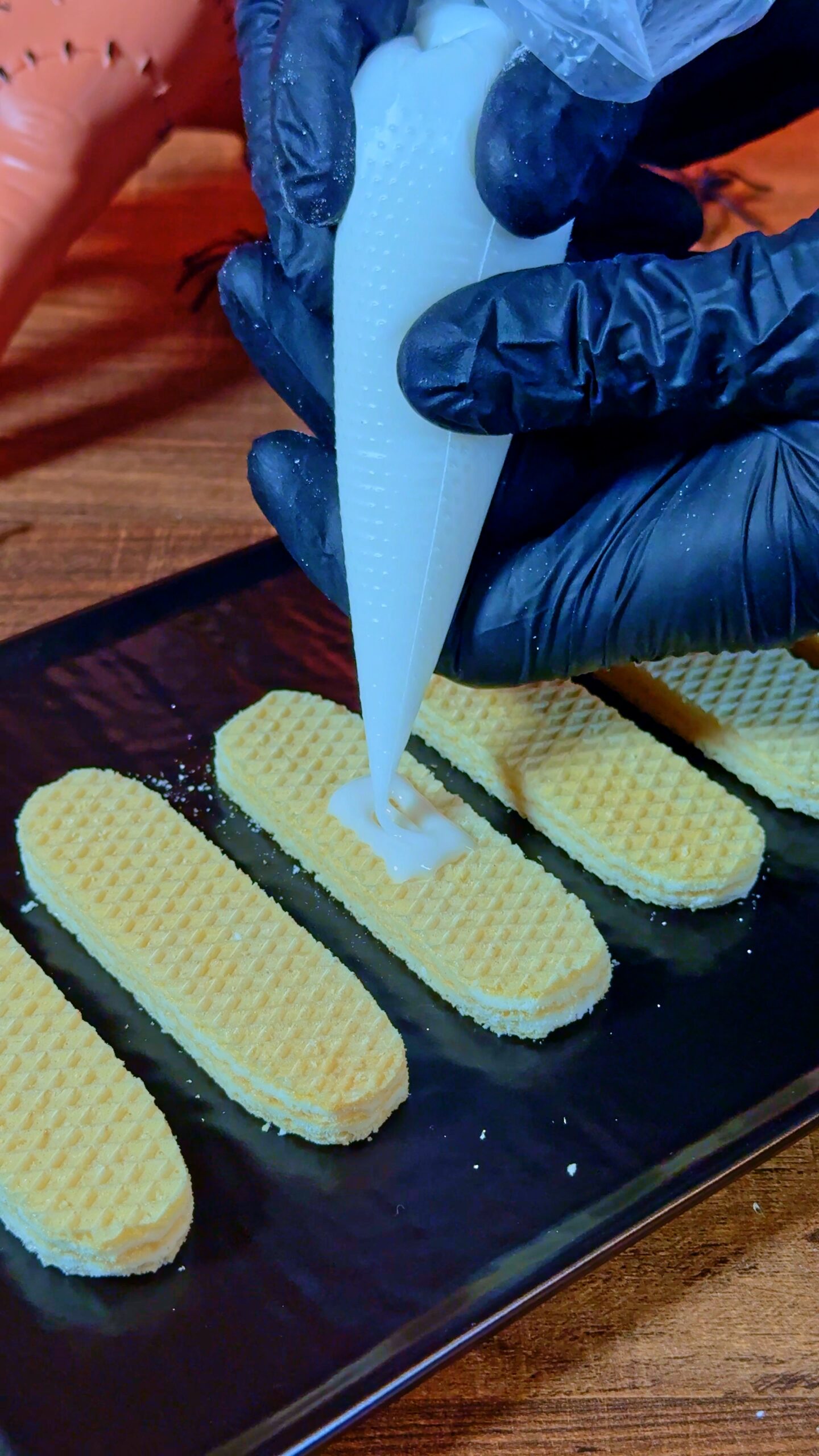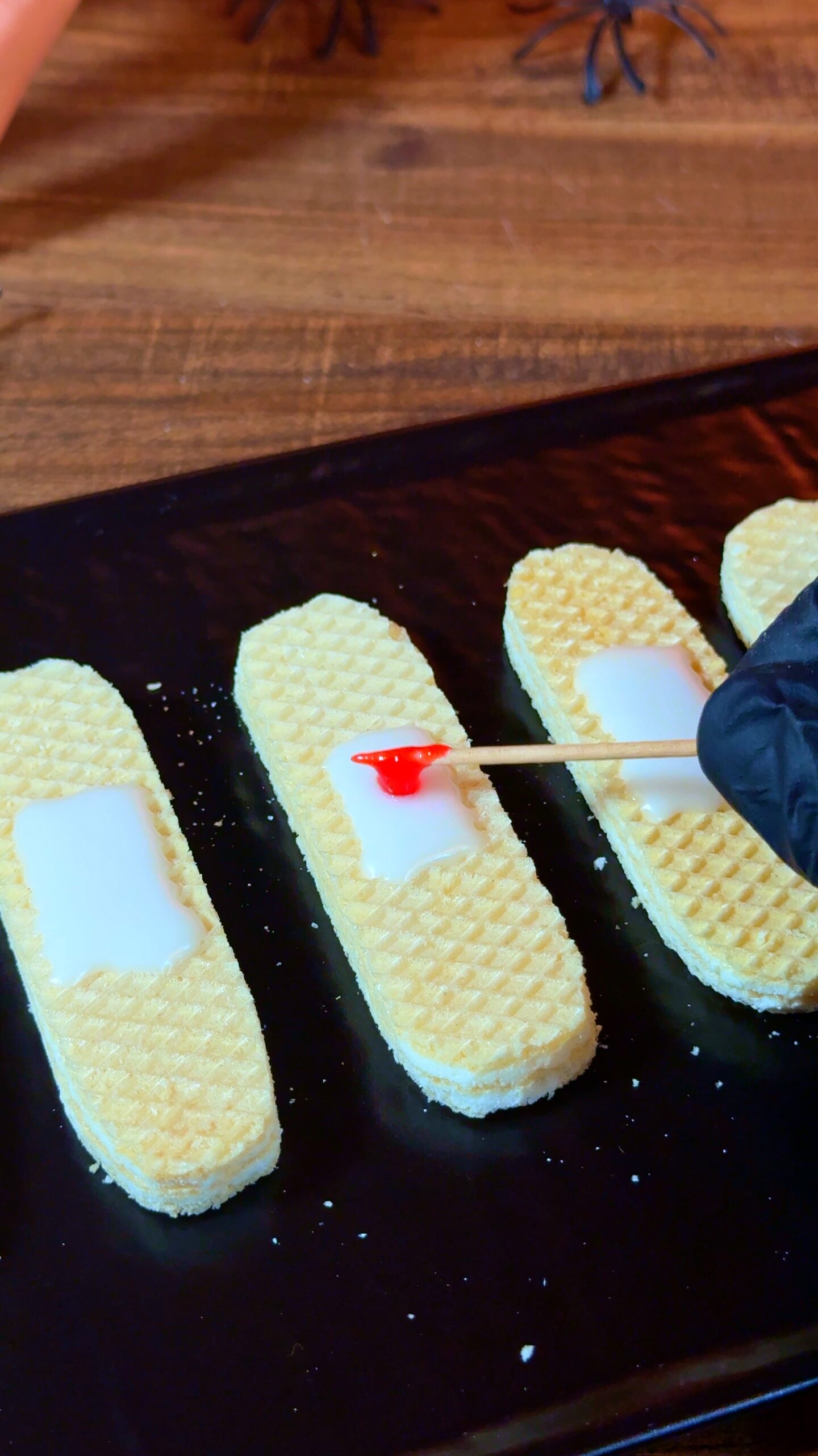 Dolcetto veloce, goloso e perfetto per un buffet spaventoso! Se cerchi un’idea lampo per arricchire la tua tavola di Halloween, questi “cerotti” sono la soluzione ideale. A prima vista sembrano oggetti sanitari usati e decisamente poco invitanti, ma in realtà sono deliziosi biscotti che si mangiano volentieri! Il segreto sta nell’effetto visivo: la forma del wafer limato unita al rosso della marmellata crea un’illusione “paurosamente realistica”, simulando una ferita in modo perfetto.